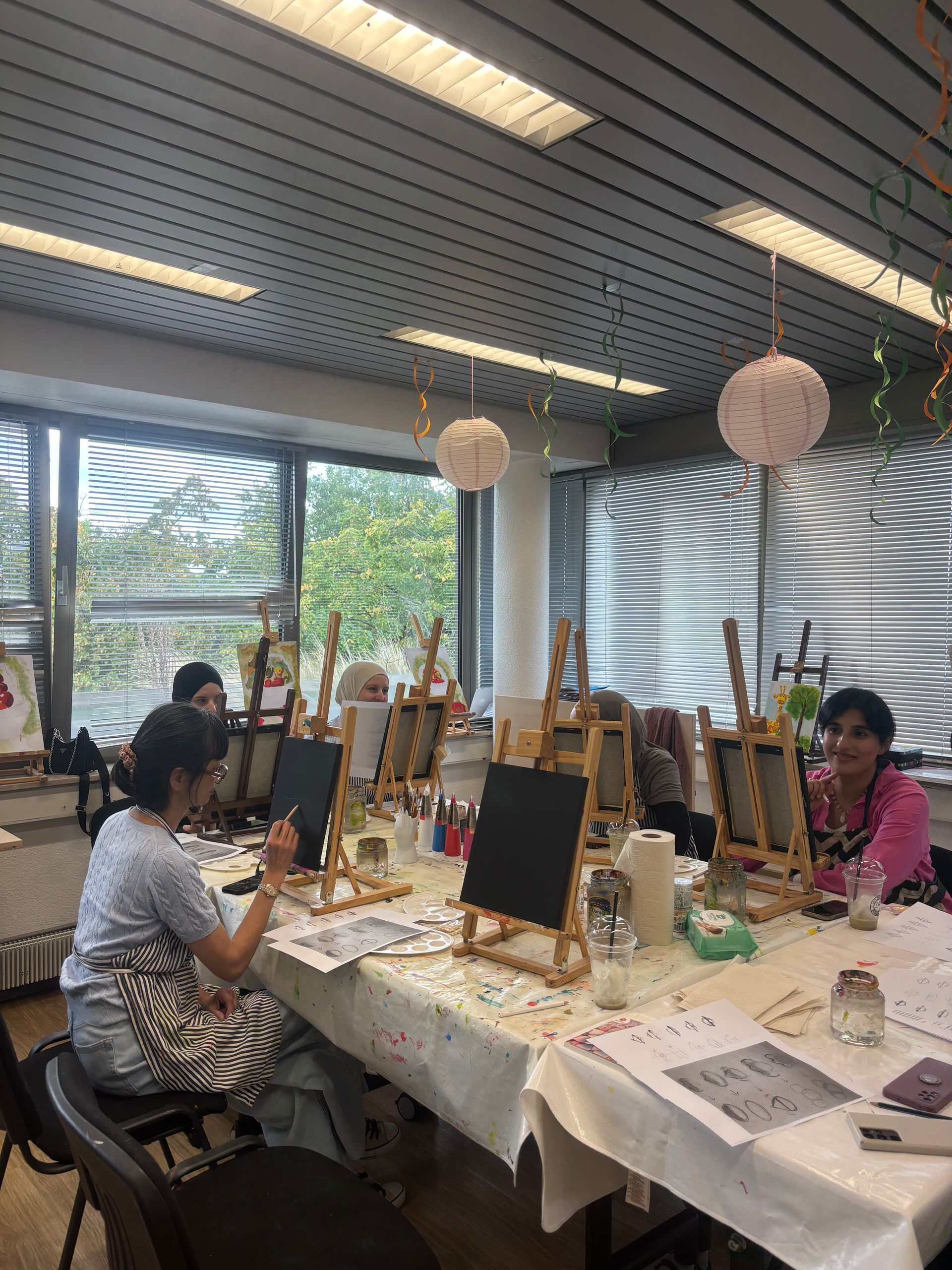 Unter Anleitung einer Künstlerin konnten die Teilnehmerinnen bei einem Kunst-Workshop in Ratingen am 13. September 2025 verschiedene Maltechniken ausprobieren und ihre Kreativität frei entfalten.